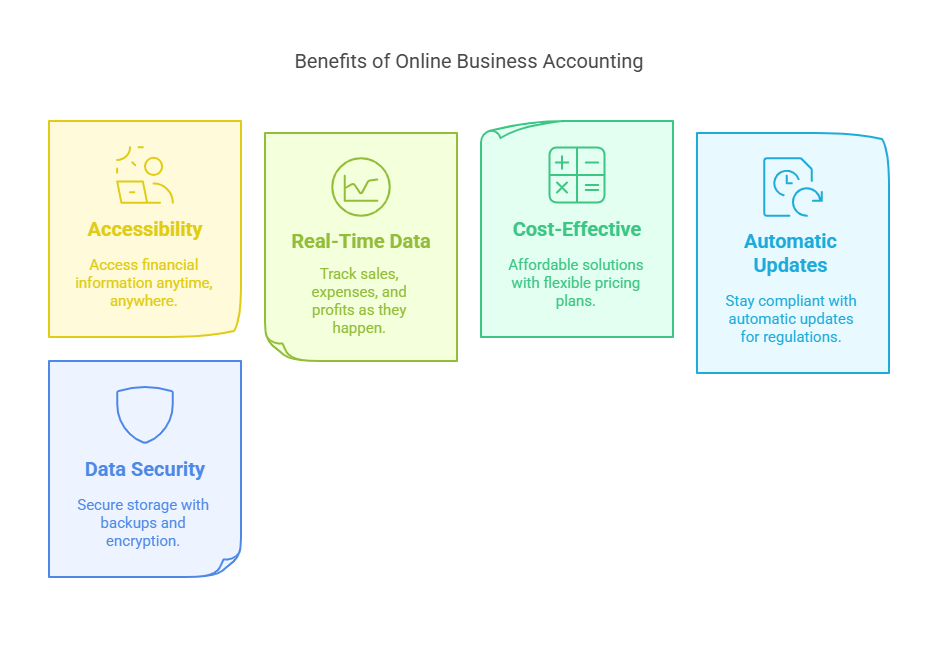 Online business accounting refers to using cloud-based software applications to manage a company’s financial operations. This includes tracking income and expenses, managing invoices, preparing financial statements, and ensuring compliance with tax regulations. Cloud-based platforms allow business owners to access their financial data from anywhere, making it easier to stay on top of their finances.
